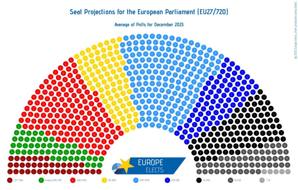 A questo punto è necessario passare dai dati certi alle previsioni. Ai sondaggi. Il più affidabile è quello curato da “Europe elects” un sito aggregatore di rilevazioni di cui propone la media. Europe elects pubblica i risultati alla fine di ogni mese. Curiosamente il mese di gennaio non è ancora uscito. Ci affidiamo quindi a dicembre, mese che registra movimenti interessanti e una tendenziale parità tra Conservatori e ID, con una leggera crescita di quest’ultimi. I Popolari sono saldamente in testa con 179 seggi, un paio in più del mese precedente, il risultato migliore degli ultimi due anni. A seguire S&D, socialisti e democratici, stabili con 141 seggi.