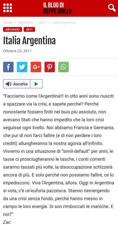 Nel “trattato economico” di Grillo, pubblicato nel giorno in cui si tenevano le elezioni argentine, il fondatore dei 5 Stelle parla di un Paese che “sta riemergendo da una crisi senza fondo, perché hanno messo in campo le loro energie, si sono rimboccati le maniche”. Grillo fa quindi un ardito paragone con la situazione italiana: “Noi abbiamo Francia e Germania che pur di non farci fallire (e di non perdere i loro crediti) allungheranno la nostra agonia all’infinito. Vivremo in una situazione di simil-default per anni, le tasse ci prosciugheranno le tasche, i conti correnti saranno tassati più volte, la disoccupazione schizzerà ancora di più”, invocando di fatto un default risolutivo della crisi del debito.