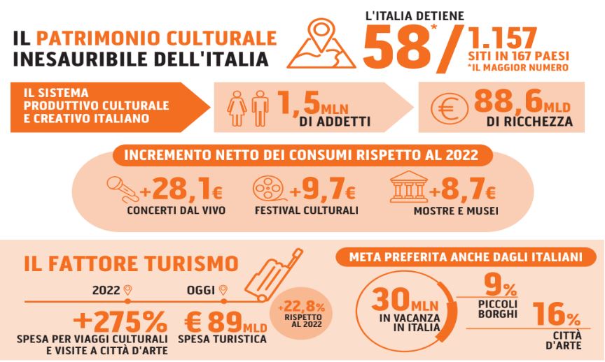 Investire nella cultura significa investire nel futuro dell’Italia, valorizzando il suo patrimonio e promuovendo uno sviluppo sostenibile e inclusivo. Significa rendere la cultura accessibile, soprattutto per le generazioni di giovani che se ne sono disinteressate. Significa incentivare i consumi culturali.