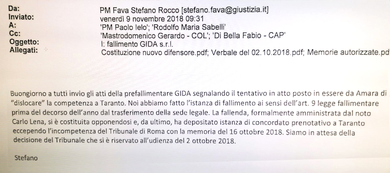 Amara, oltre a incassare da Eni, in quei giorni decide di spostare la sede legale delle sue aziende a Martina Franca, in provincia di Taranto. Perché? I rapporti con il procuratore Carlo Maria Capristo. Fava aveva ipotizzato subito che era tutta una manovra per evitare l’accusa di bancarotta. Con il trasferimento di sede si bloccherebbe tutto. Il problema è che lo spostamento è finto. La guardia di finanza, mandata da Fava in Puglia, non aveva trovato nulla. Neppure il nome delle società sul citofono. Fava decide quindi di scrivere una mail a Ielo e a Rodolfo Sabelli, l’altro aggiunto. In copia il colonnello Gerardo Mastrodomenico e Fabio Di Bella, gli ufficiali del Gico che l’anno dopo svolgeranno le indagini contro Luca Palamara. Risposta? Nessuna. Anzi, no: alla sua richiesta di arresto di Amara per queste imputazioni, dopo qualche mese, il fascicolo gli verrà tolto.