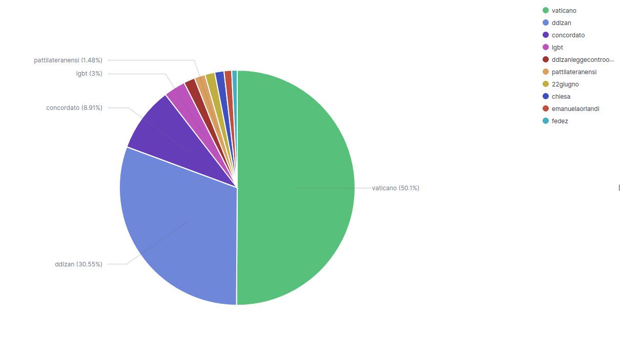 HASHTAGS – Le parole chiave per individuare tali discussioni sui social sono state, oltre a Vaticano, ddlzan e concordato “la maggior parte delle persone non sapeva manco che esistesse il concordato come strumento giuridico di relazione tra Stato e Chiesa Vaticana – spiega Varriale – bene però che questa polemica abbia insegnato qualcosa di nuovo alla massa. Oltre all’hashtag LGBT e Chiesa, rimbalza all’occhio quello di Emanuela Orlandi e questo dimostra che il livello di aggressività e di strumentalizzazione nei confronti del clero abbia avuto anche toni accesi che fanno riferimento ad una delle peggiori pagine della storia Vaticana”.