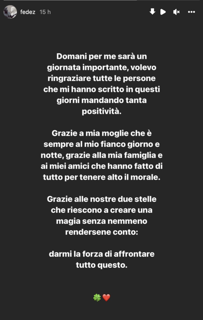 “Grazie a mia moglie che è sempre al mio fianco giorno e notte, grazie alla mia famiglia e ai miei amici che hanno fatto di tutto per tenere alto il morale” si legge sulla story. Senza dimenticare, ovviamente, i due figli Leone, 4 anni, e Vittoria, un anno: “Grazie alle nostre due stelle che riescono a creare una magia senza nemmeno rendersene conto: darmi la forza di affrontare tutto questo.”