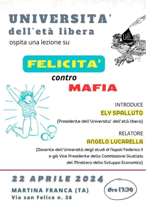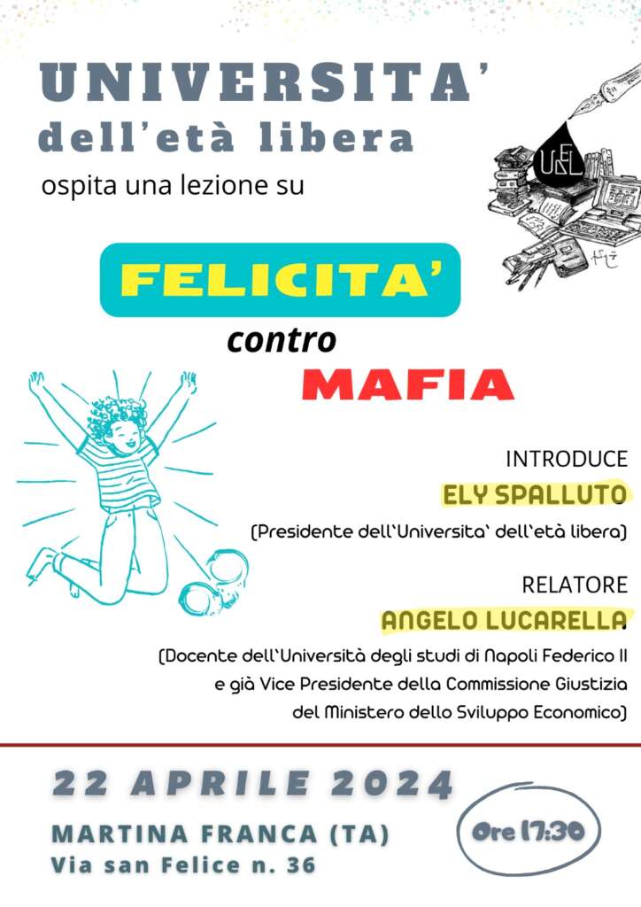 Si tratta di un percorso che muove i passi dal senso etimologico della parola e del come puntare alla felicità in senso individuale e comunitario, passando per la storia dell’Unità d’Italia, fino a giungere alla contemporaneità della dimensione costituzionale della nostra realtà sociale”. E’ quanto dichiara Lucarella, docente dell’Università di Napoli Federico II, già vice presidente della Commissione Giustizia del Ministero dello Sviluppo Economico ed esperto giurista invitato dal World Justice Project (sostenuto dalla Commissione Europea) per il 2024.L’Università dell’età libera di Martina Franca (Ta), presieduta dalla Dott.ssa Ely Spalluto, ospiterà la prossima lezione itinerante il 22 aprile 2024 alle ore 17:30.