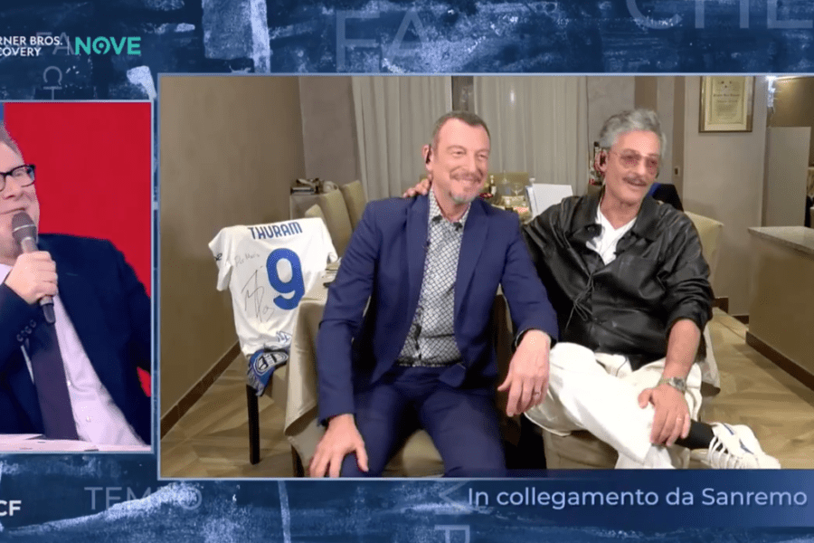 “Una presenza”, quella di Amadeus e Fiorello da Fazio, che il direttore generale della Rai Giampaolo Rossi aveva definito in mattinata “frutto di una scelta ponderata, avallata dai vertici aziendali”. Anche qui Fiorello non le manda a dire: “Quando è scoppiata la querelle sul vincitore di Sanremo che non poteva andare sul Nove, devo dire che Amadeus si è speso molto, lo avrebbe voluto, anche il dg Rossi lo voleva, anche l’Ad Sergio. Solo uno si è messo di traverso, Milo Infante”. La coppia è in collegamento mentre segue la sfida scudetto tra la loro Inter e la Juventus (alle spalle di Amadeus c’è la maglia di Thuram).