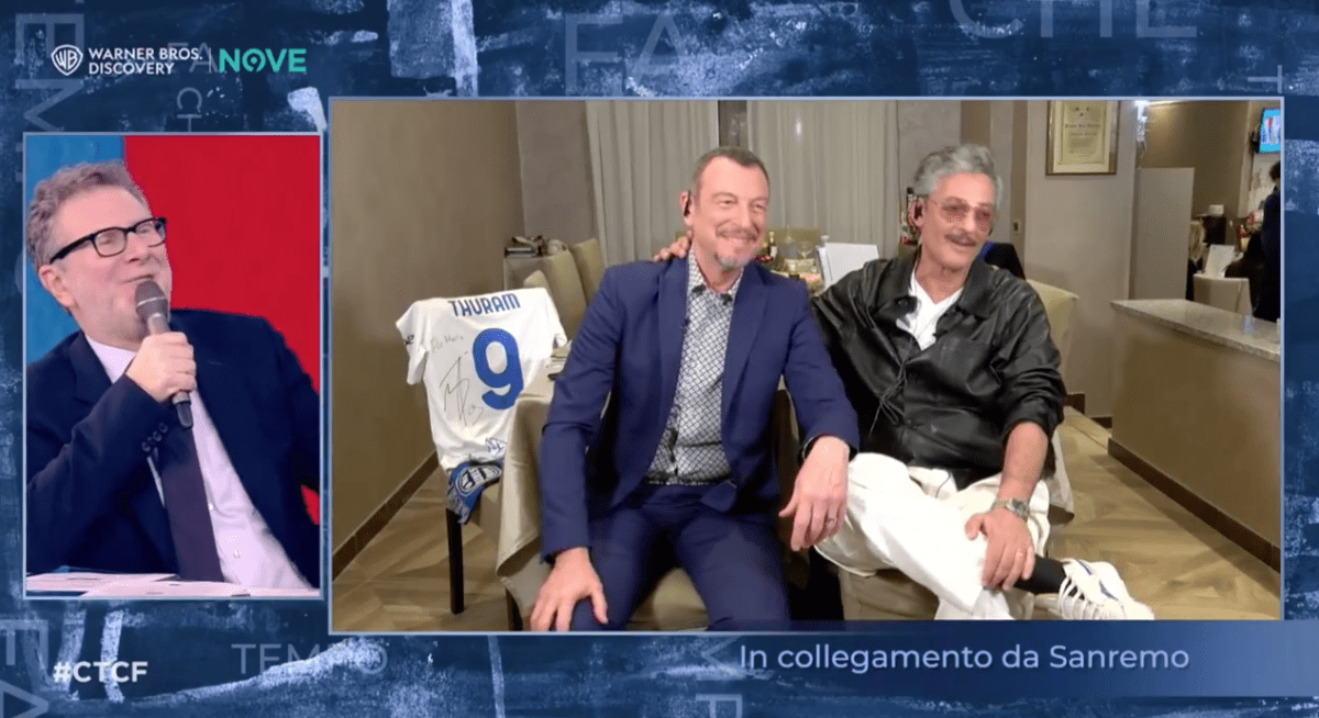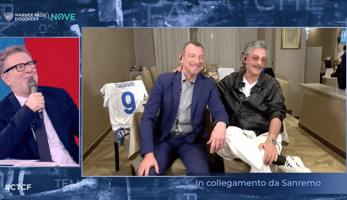 “Una presenza”, quella di Amadeus e Fiorello da Fazio, che il direttore generale della Rai Giampaolo Rossi aveva definito in mattinata “frutto di una scelta ponderata, avallata dai vertici aziendali”. Anche qui Fiorello non le manda a dire: “Quando è scoppiata la querelle sul vincitore di Sanremo che non poteva andare sul Nove, devo dire che Amadeus si è speso molto, lo avrebbe voluto, anche il dg Rossi lo voleva, anche l’Ad Sergio. Solo uno si è messo di traverso, Milo Infante”. La coppia è in collegamento mentre segue la sfida scudetto tra la loro Inter e la Juventus (alle spalle di Amadeus c’è la maglia di Thuram).