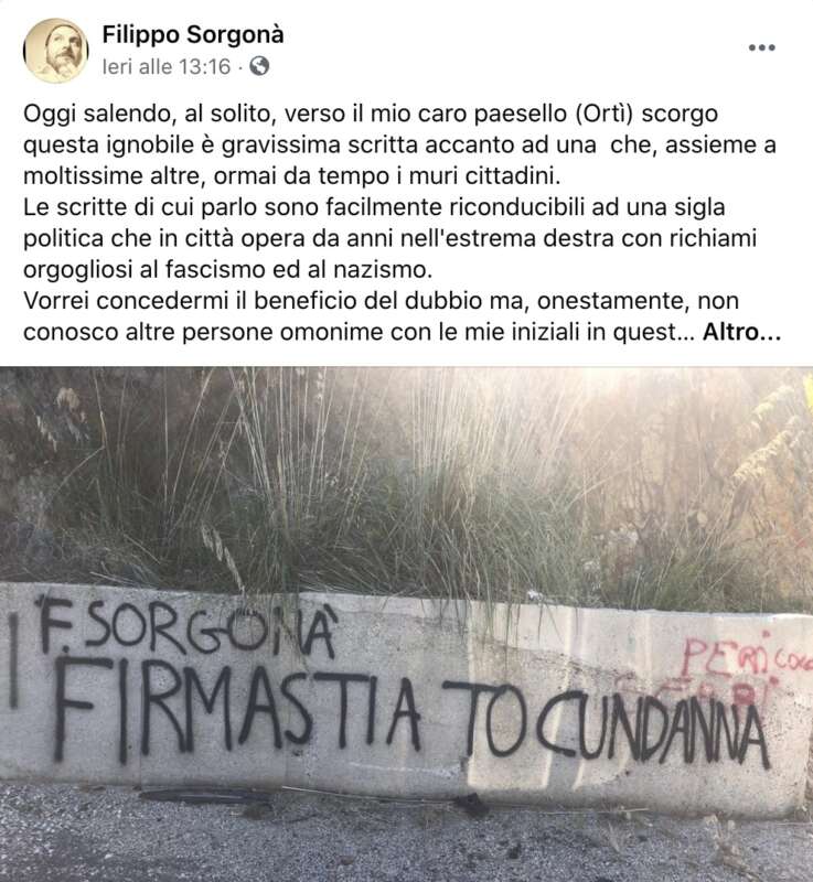 Come raccontato dallo stesso Sorgonà, sabato l’attivista recandosi presso Ortì, il suo paese, ha notato la scritta su un muro, accanto ad altre che da tempo sono comparse in città. “Le scritte di cui parlo sono facilmente riconducibili ad una sigla politica che in città opera da anni nell’estrema destra con richiami orgogliosi al fascismo ed al nazismo. Vorrei concedermi il beneficio del dubbio ma, onestamente, non conosco altre persone omonime con le mie iniziali in questa circoscrizione e, d’altronde, questo episodio si aggiunge ad altri innumerevoli di diffamazioni e minacce che giungono da troppo tempo sempre da questi stessi ambienti”; denuncia il coordinatore delle Sardine di Reggio Calabria.