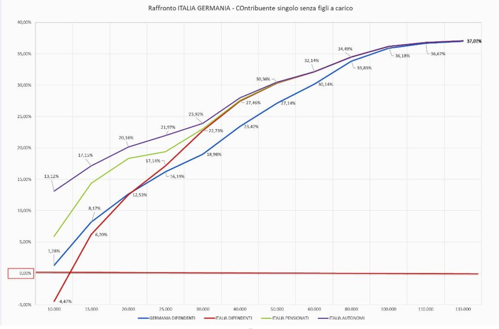 Non lo possiamo né vogliamo credere, ma è un dato di fatto che, sino ad oggi, tutti gli interventi dei più autorevoli esponenti politici di maggioranza e di governo hanno parlato dei vizi e delle virtù del sistema tedesco ad “aliquota continua da zero al massimo previsto”, come se fosse qualcosa che in Italia non c’è già, mentre c’è da sempre. Se invece l’idea è quella di avvicinare il disegno della curva della progressività italiana a quello della curva della progressività tedesca per il tipo di disegno, piuttosto che per i pennelli con cui viene disegnato, la questione diventa sostanziale e molto interessante. Sia però chiaro a coloro che, nell’inneggiare al sistema tedesco, chiedono sorprendentemente anche più progressività, che la curva tedesca è meno progressiva della nostra nel passaggio dai redditi bassi ai redditi medi e medio-alti.