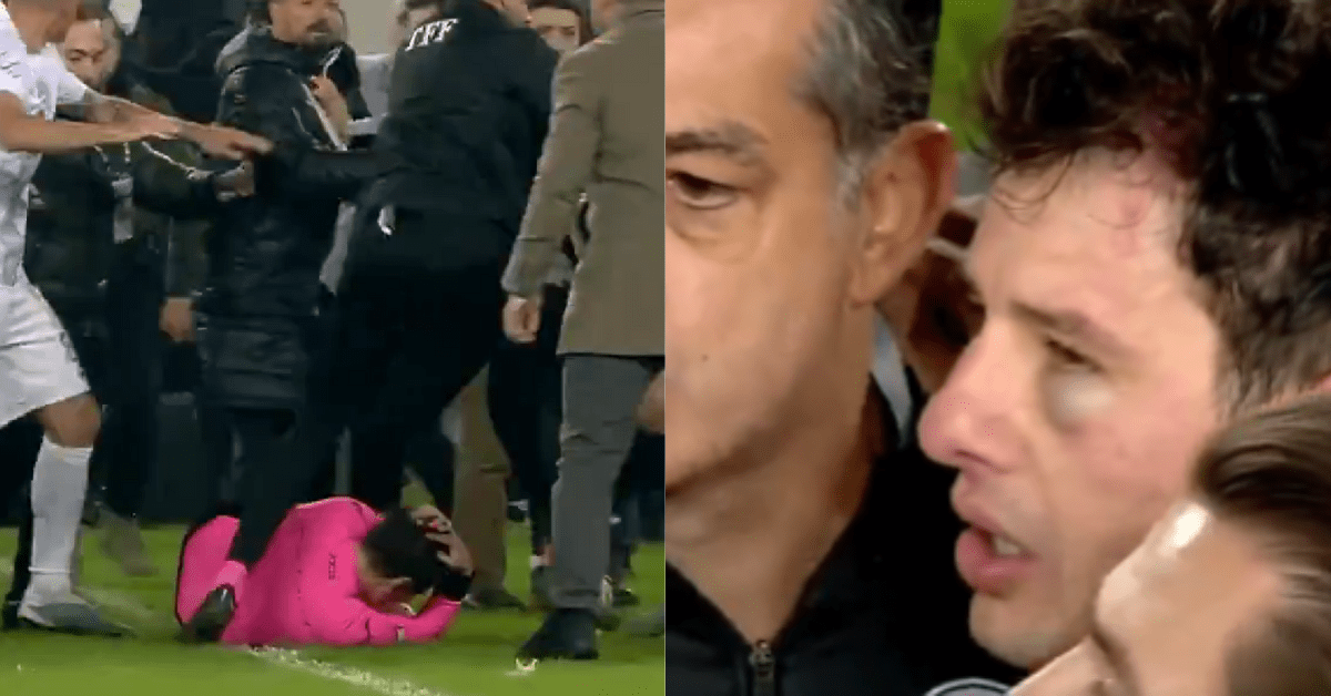 Nelle immagini circolate nei minuti successivi, si è visto Halil Umut Meler, l’arbitro, con il volto tumefatto e l’occhio sinistro visibilmente gonfio. Tanto che si è reso necessario il trasferimento in ospedale, secondo i media turchi.