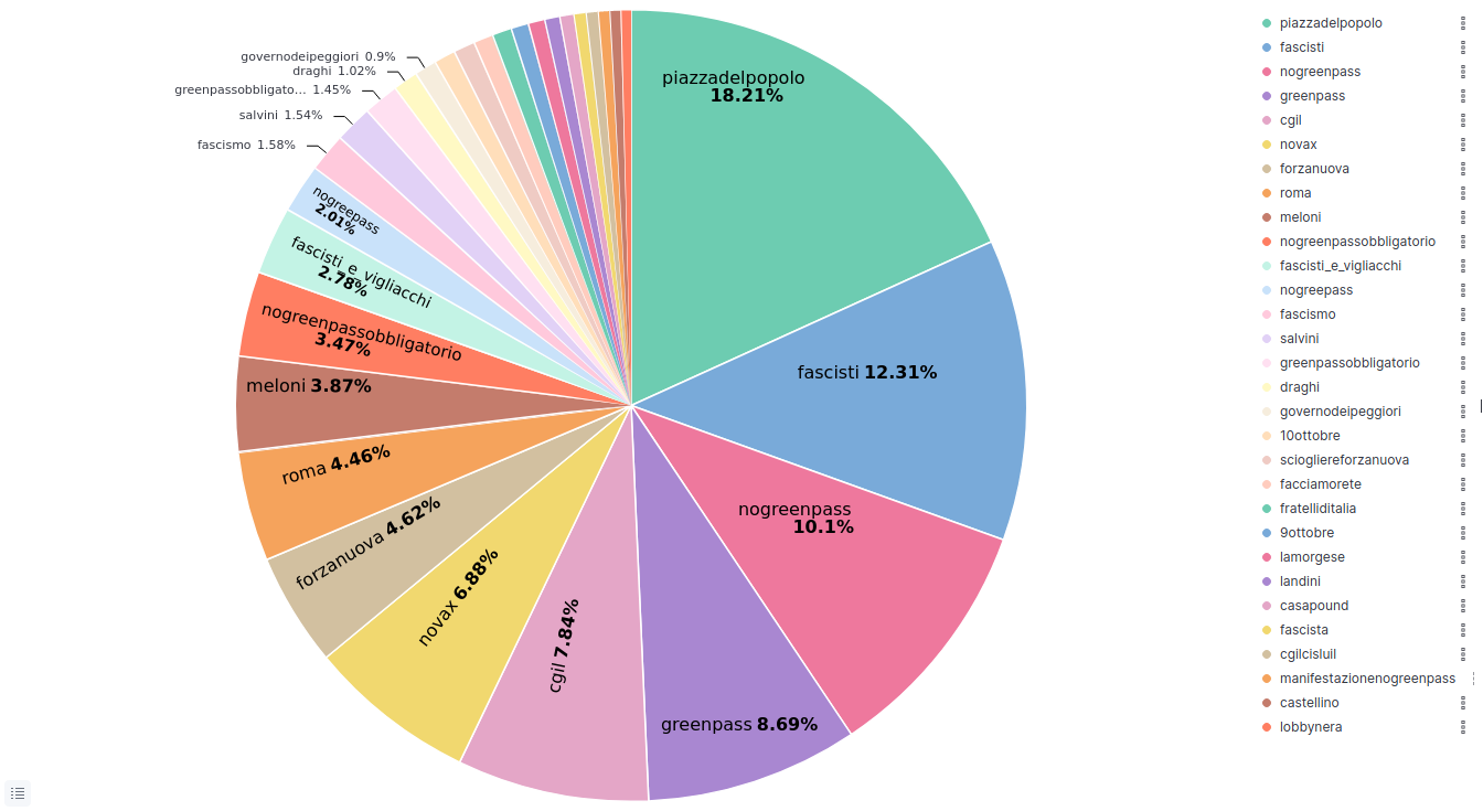Gli argomenti più utilizzati sono stati invece piazzadelpopolo, fascisti, nogreenpass, cgil, novax e forza nuova. In linea con le preferenze del pubblico ai tweets preferiti, ma è chiaro che l’indirizzo politico di accusa è rivolta a Meloni e Salvini che hanno fatto giungere dichiarazioni di condanna facendo attendere più del dovuto il pubblico. Le citazioni rivolte a lamorgese hanno riguardato aspre critiche su come fosse accaduto tutto questo, ma strano che, a parte Gassman, Rud Dureghello, Cathy la Torre nella top degli argomenti manca il nome di Michetti, presente in appena 840 tweets ed autore della dichiarazione “I manifestanti pacifici vanno sempre tutelati, mentre quelli violenti vanno separati e le loro azioni severamente condannate”. “Questo può essere un segnale non preoccupante su eventuali ripercussioni nella campagna elettorale ancora in corso per il campidogli, ma il fail comunicativo sugli ebrei potrebbe alla lunga pesare quanto la dichiarazione di Grillo all’epoca che di dichiarò peggio di Hitler”, commenta Varriale.