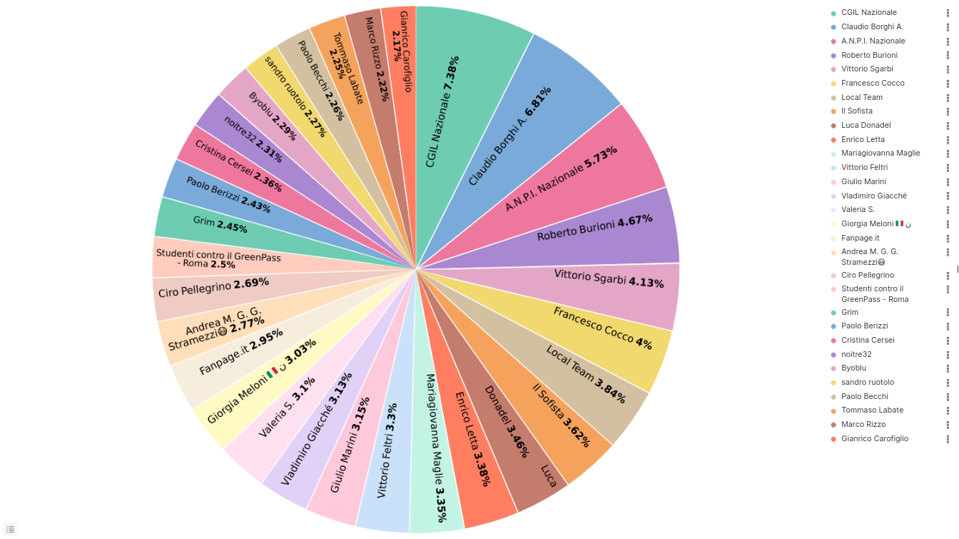 Quelli che hanno trattato con più tweet l’argomento ed hanno riscosso grande partecipazione nelle condivisioni, sono stati: CGIL, Borghi della Lega, ANPI, Burioni e Sgarbi.