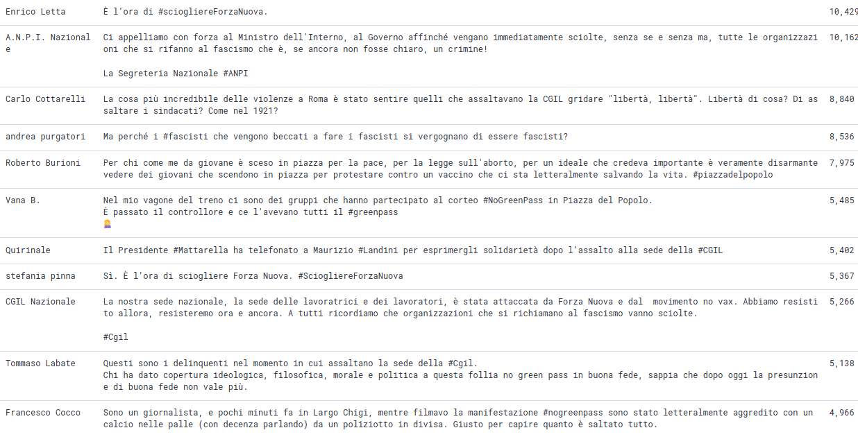 I dati emergono dall’ultima analisi realizzata dal Data Journalist, Livio Varriale, che ha effettuato la ricerca sulle parole, Meloni, fascisti, #piazzadelpopolo, greenpass, mussolini e Forza Nuova. “Il clamore generato dall’evento è stato imponente con 68 mila commenti circa in meno di 48 ore ed il milione di mi piace, unitamente ai 133 mila commenti, fa rendere di molto l’idea non solo della partecipazione, ma anche dello schieramento del pubblico se analizziamo chi sono coloro che hanno ricevuto più preferenze ai tweets comprendiamo che a catalizzare l’attenzione è stata la sinistra che ha più volte citato la matrice fascista e soprattutto con Letta, l’Anpi e la CGIL si è chiesto lo scioglimento come previsto da legge. A proposito della CGIL, il tweet istituzionale del Quirinale risulta tra i più graditi”.