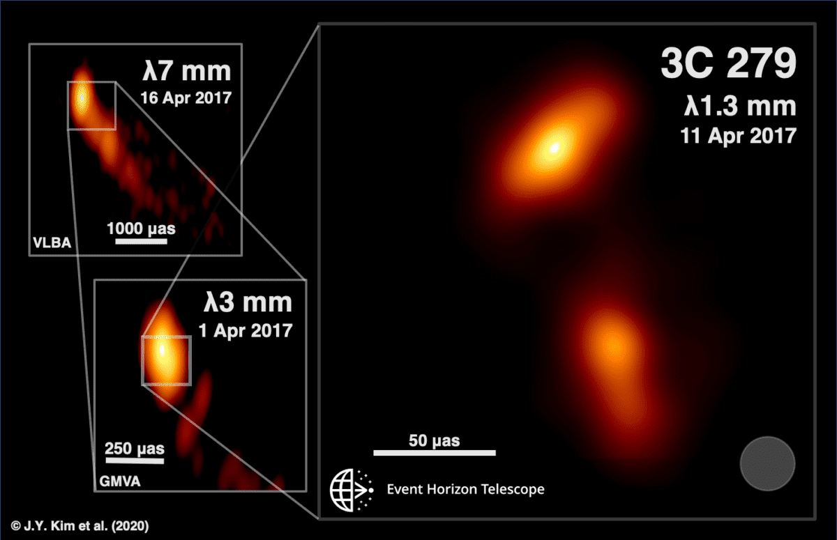La collaborazione scientifica internazionale Event Horizon Telescope (EHT), che ha realizzato la famosissima prima immagine di un buco nero, ora è riuscita a ritrarre, con un livello di dettaglio inedito, il quasar 3C 279, un getto relativistico, originato probabilmente dalle vicinanze di un buco nero supermassiccio. La tecnica utilizzata da EHT, chiamata interferometria a base molto lunga (VLBI), ha permesso agli scienziati di studiare la morfologia su scala fine del getto vicino alla sua base, dove si pensa abbia origine un emissione di raggi gamma molto variabile. I risultati sono pubblicati nel numero di Astronomy and Astrophysics del 7 aprile. La collaborazione EHT continua così a estrarre informazioni fondamentali dalla eccezionale raccolta dati della campagna osservativa globale condotta nell’aprile 2017.