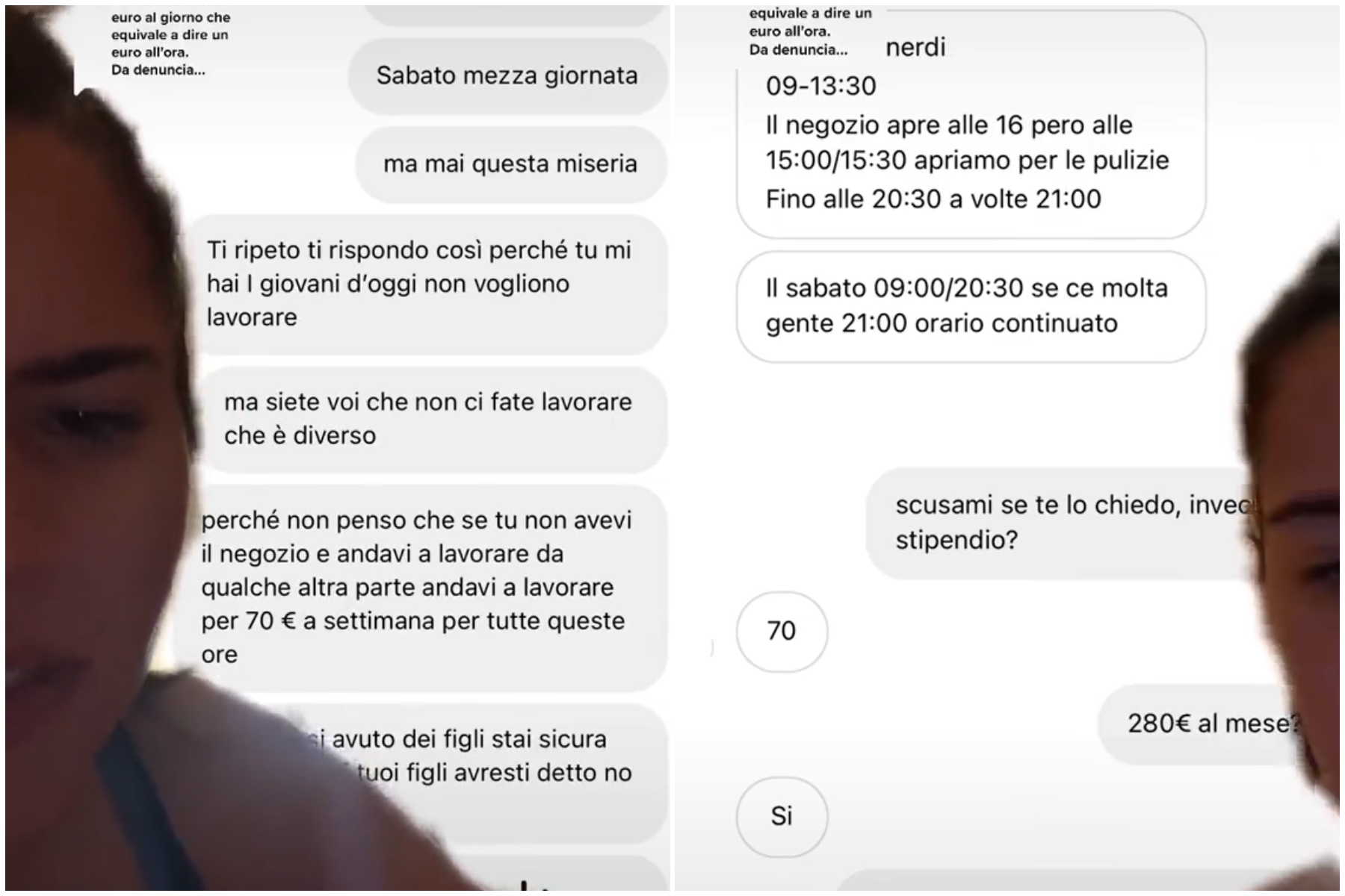 Tutto è nato da uno dei tanti annunci pubblicati sui social, nei gruppi Facebook di quartieri ad esempio. Francesca risponde chiedendo maggiori informazioni. E’ interessata perché il negozio in questione si trova a poca distanza da casa sua e quindi potrebbe anche arrivarci a piedi. Dopo essere stata contatta in chat, le viene chiesto se avesse già altre esperienze lavorative poi quando si è affrontato il tema della retribuzione la situazione è degenerata. Stando alla richiesta della titolare del negozio, gli orari erano dal lunedì al venerdì dalle 9 alle 13.30 e dalle 15 alle 20.30. Il sabato invece orario continuato dalle 9 alle 20.30 per uno stipendio pari a 70 euro a settimana, 280 euro al mese, poco più di un euro all’ora.