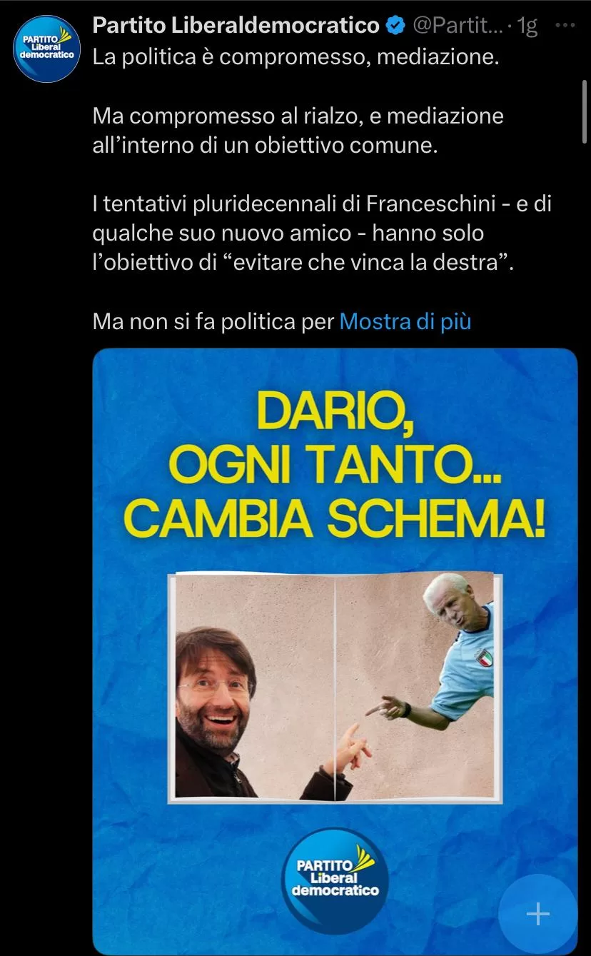 Per la verità, a metterlo in mezzo è stato Luigi Marattin che pur di abbassare l’asticella della qualità del gioco politico di Franceschini che gli aveva precedentemente lisciato il pelo, cita il tecnico di Cusano Milanino per replicare al suo ex compagno di viaggio. Nel post pubblicato sull’account X lo scorso 22 luglio, il segretario dei Liberal Democratici, scrive: “Franceschini è un politico esperto, di grande spessore e pure molto simpatico. Ma, come Trapattoni, gioca per decenni sempre con lo stesso schema solo che almeno il Trap ogni tanto vinceva”. Lo schema Franceschini censurato da Marattin sarebbe quello di mettere tutti assieme, un catenaccio impenetrabile con dentro gli estremi inconciliabili perché “secondo lui – continua Marattin – così si vincono le elezioni.