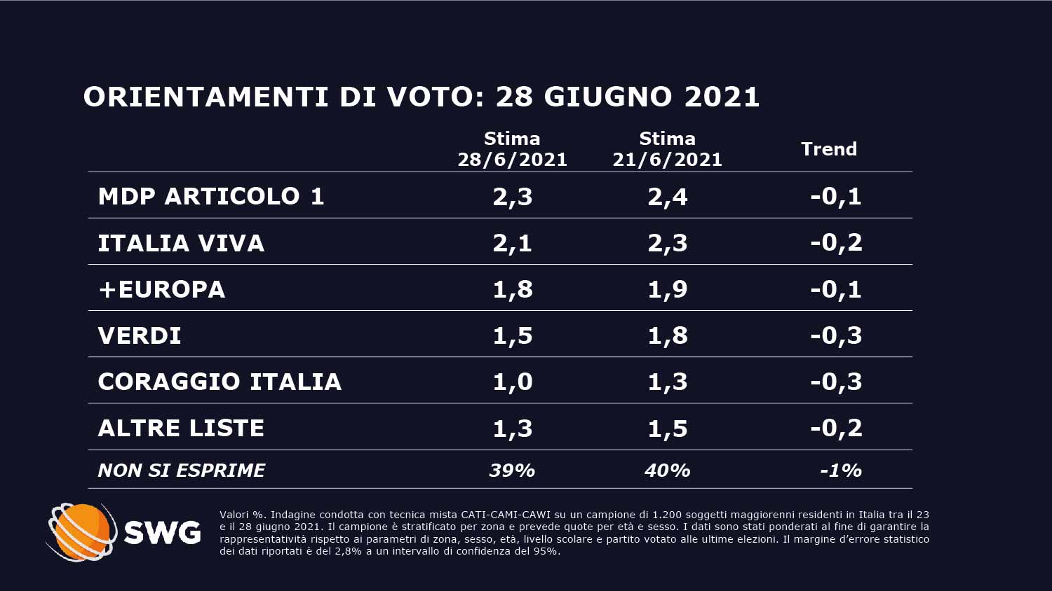 Con il Movimento 5 Stelle – nonostante la crisi, il caos, la rottura interna scatenata dal faccia a faccia sullo Statuto, e sulla natura del futuro del Movimento, tra il fondatore e Garante Beppe Grillo e l’ex premier e nuovo leader Giuseppe Conte – che guadagna uno 0,6% e sale al 16,6%; l’alleanza giallorossa arriva al 35,4%. Molto lontano quindi dal 48% del centrodestra unito. Perderebbe tuttavia consenso in questa fase la Lega di Matteo Salvini, – 0,3, per un finale 20,3. Il Carroccio anche nella rilevazione citata precedentemente di Ipsos era dietro Fdi. Nel precedente sondaggio Swg invece Fdi, al 20,5%, aveva praticamente agganciato la Lega, al 20,6%. Forza Italia invece sale dello 0,2 e arriva al 7,0. Segue Azione, 3,9; Mdp Articolo 1, 2,3; Italia Viva, 2,1; +Europa, 1,8; Verdi, 1,5; Coraggio Italia, 1,0; Altre liste, 1,3. Non si esprimono il 39% degli intervistati invece. Un dato in calo dell’1%.