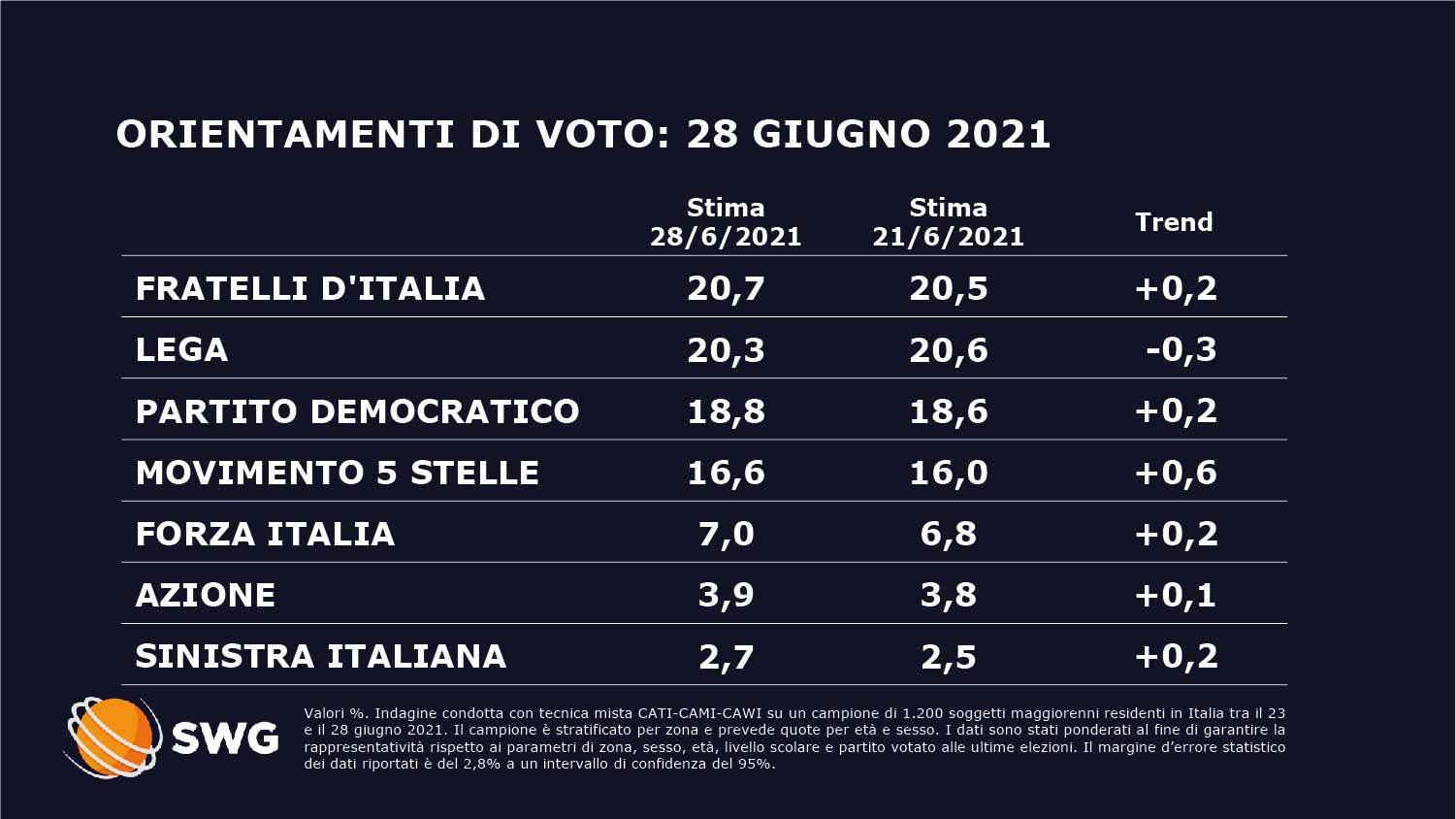 Per la prima volta, dunque il primo partito per Swg è Fratelli d’Italia. Il movimento cresce di 0,2 ed è al 20,7%. L’opposizione paga. Meloni raccoglie i consensi degli elettori di destra che non si riconoscono nel governo Draghi. La leader romana – che a Roma ha voluto il candidato Enrico Michetti per il Campidoglio – ha riunito una parte di destra confusa negli ultimi anni, nazionalistica, senza un luogo. Ha pubblicato di recente una biografia che sta vendendo piuttosto bene, Io sono Giorgia.