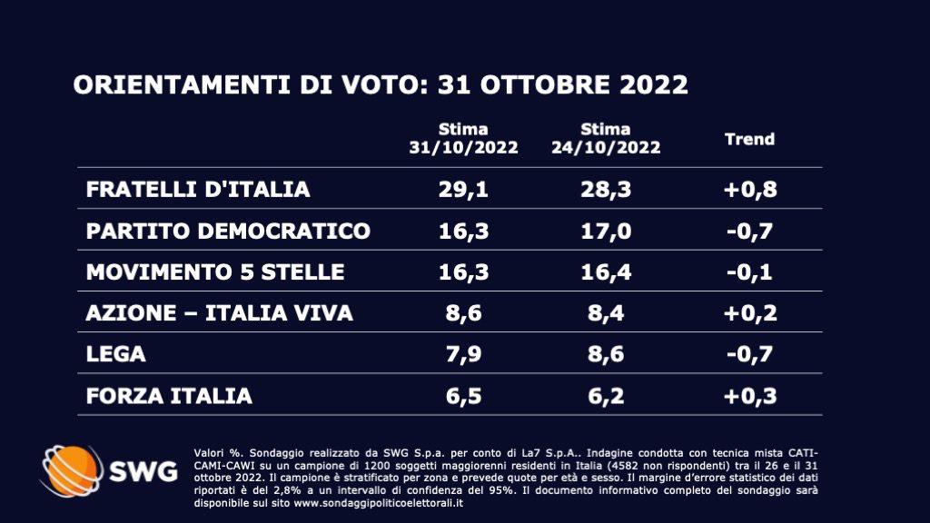 Il sondaggio è stato realizzato da SWG S.p.a. per conto di La7 S.p.a. Un’indagine condotta con tecnica mista CATI-CAMI-CAWI su un campione di 1200 soggetti maggiorenni residenti in Italia (4582 non rispondenti) tra il 26 e il 31 ottobre 2022. Il campione è stratificato per zona e prevede quote per età e sesso. Il margine d’errore statistico dei dati riportati è del 2,8% a un intervallo di confidenza del 95%.
