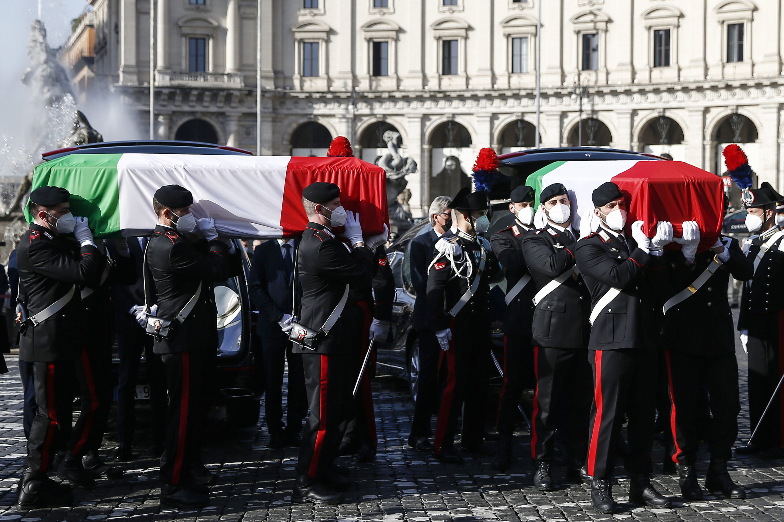 I loro feretri, avvolti nel tricolore, sono stati trasportati nella basilica di Santa Maria degli Angeli a Roma dai carabinieri del XIII reggimento, quello di Iacovacci. Presenti il premier Mario Draghi, i ministri Lorenzo Guerini, Luigi Di Maio, Luciana Lamorgese, Giancarlo Giorgetti e i presidenti di Camera e Senato Roberto Fico e Maria Elisabetta Casellati, oltre alle famiglie degli scomparsi.