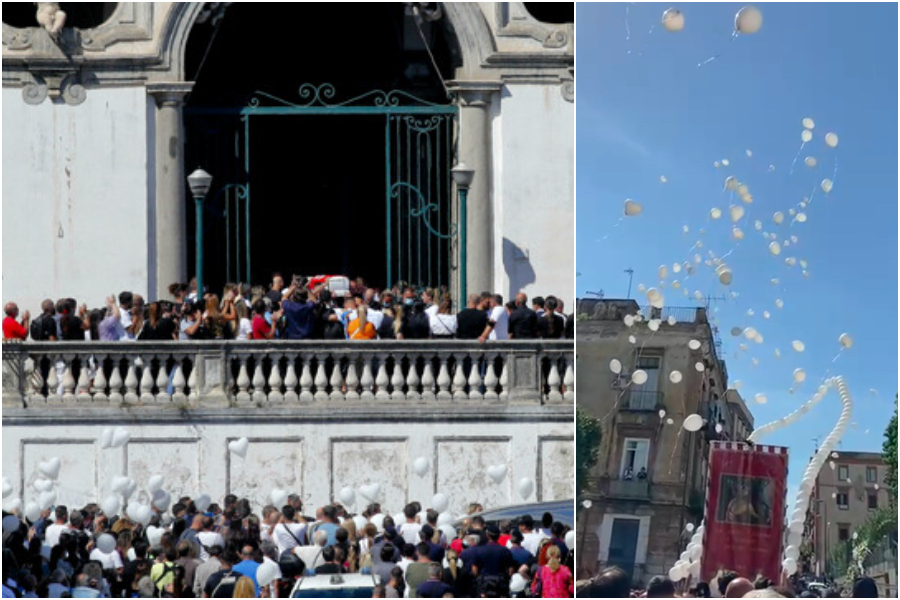 La bara bianca di Samuele è stata accolta da due ali di folla e da palloncini, circa cinquecento le persone all’interno della chiesa di Santa Maria degli Angeli con la messa celebrata dall’arcivescovo di Napoli, don Mimmo Battaglia.