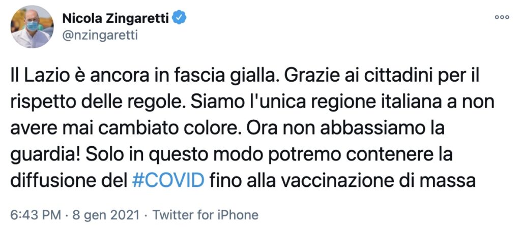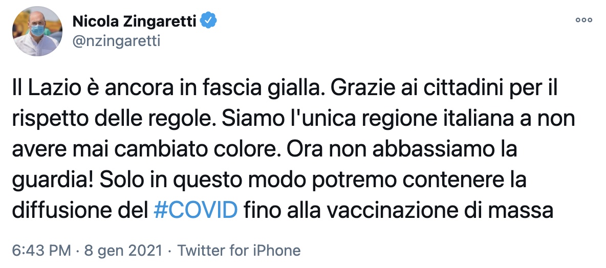 “Il Lazio è ancora in fascia gialla, ad oggi l’unica Regione italiana a non aver mai cambiato colore. Un risultato importante frutto senza dubbio delle scelte fatte in questi mesi ma soprattutto del rispetto delle norme da parte dei cittadini, cui va il mio ringraziamento”, scrive infatti poco dopo le 18 di venerdì Zingaretti su Twitter.