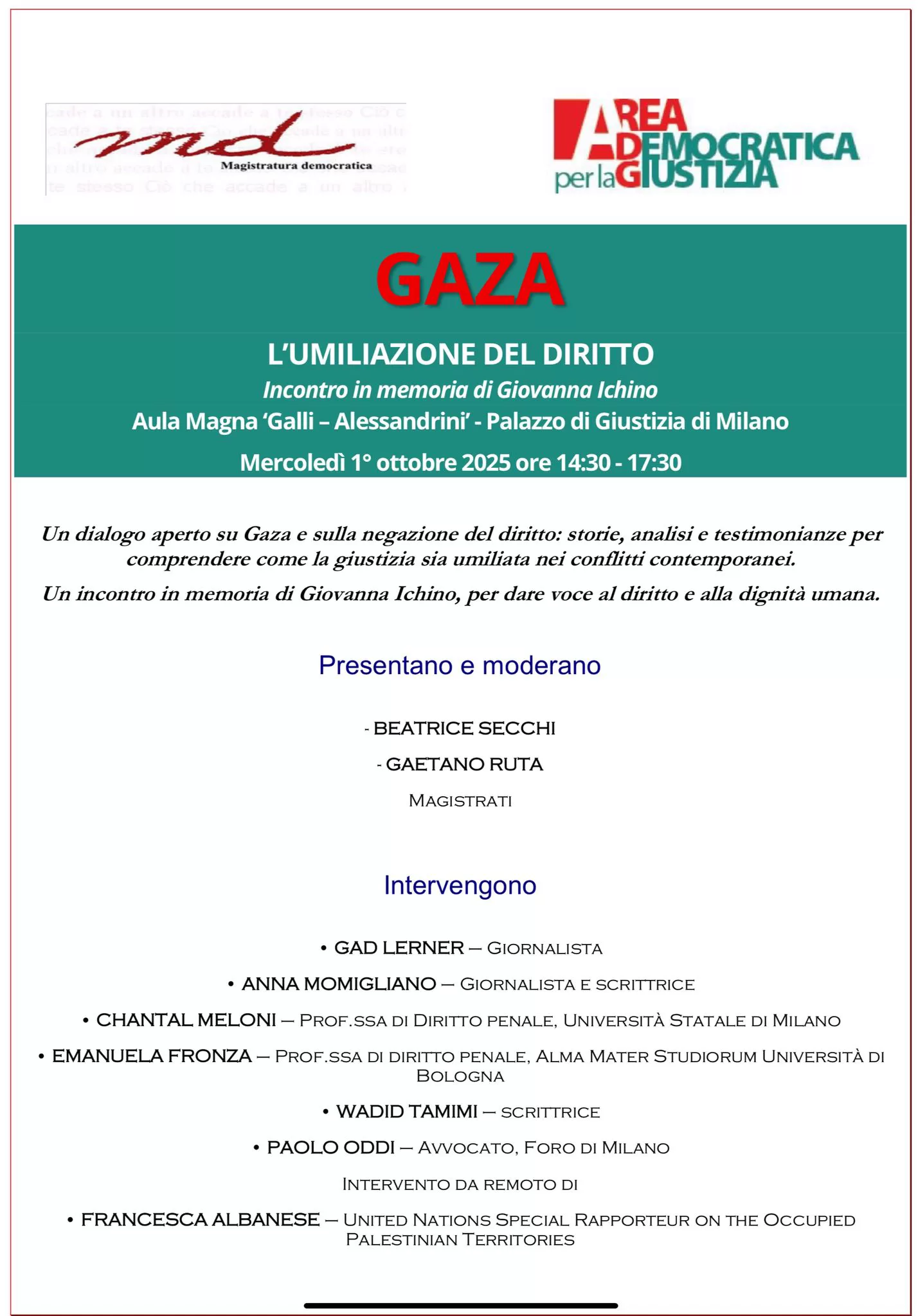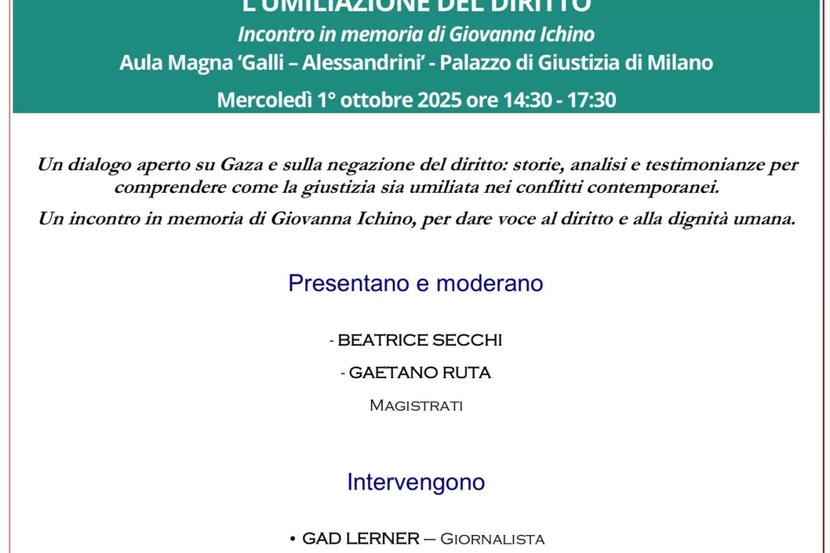 Sono almeno tre i motivi per cui lascia perplessi la scelta di tenere – domani, al Palazzo di Giustizia di Milano – il convegno organizzato da Magistratura Democratica intitolato “Gaza – L’umiliazione del diritto”. Il primo motivo di perplessità riguarda il titolo, con l’evidente taglio del convegno che esso preconizza e con il pregiudizio altrettanto evidente che lo ispira. Perché è ovvio che – negli intendimenti degli organizzatori – si tratterà del diritto umiliato non a Gaza, ma da Israele a Gaza. Si fatica a immaginare, infatti, che saranno oggetto di riflessione le rivendicazioni dei capi terroristi di Gaza di usare i civili “come attrezzi”, o il reclutamento dei bambini-soldato o – giammai! – le torture inflitte (a Gaza) agli ostaggi ebrei.