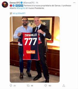 IL COMUNICATO — “Da oggi 777 Partners è proprietaria del Genoa – si legge sulla nota pubblicata dalla nuova proprietà rossoblù, che prosegue – È stato definito oggi il closing per la cessione del Genoa CFC. La holding 777 Partners è la nuova proprietaria del club più antico del calcio italiano. Il Professor Alberto Zangrillo ha fatto il suo ingresso nel consiglio d’amministrazione del Club ed è il nuovo Presidente”.