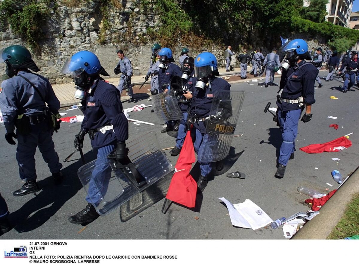 4) L’esercitazione senza regole, prevista da alti dirigenti del Viminale, si dispiegò domenica 22 luglio. Avendo schierato “l’artiglieria pesante” le forze di polizia non potevano proteggere Genova e i manifestanti dalla velocità da guerriglieri di strada dei black block. Incassato il fallimento del giorno prima e lo sdegno per la morte di Carlo Giuliani, si videro agenti armati e bardati in modo non legale picchiare selvaggiamente adolescenti, signori di mezza età, finanche portatori di handicap. La macchina mediatica fu dispiegata a pieno regime: nelle redazioni dei giornali mentre andava in scena la mattanza genovese arrivò la notizia che il leader delle Tute Bianche, Luca Casarini, si trovava placidamente assiso in un ristorante di Genova altezzosamente lontano dai lacrimogeni e dalle mazzate.