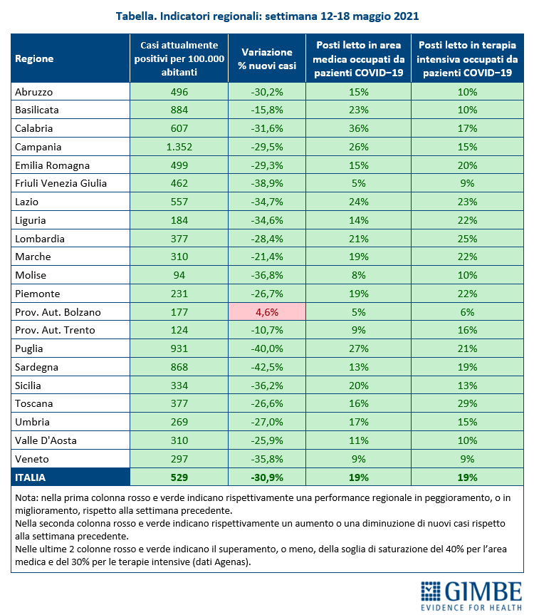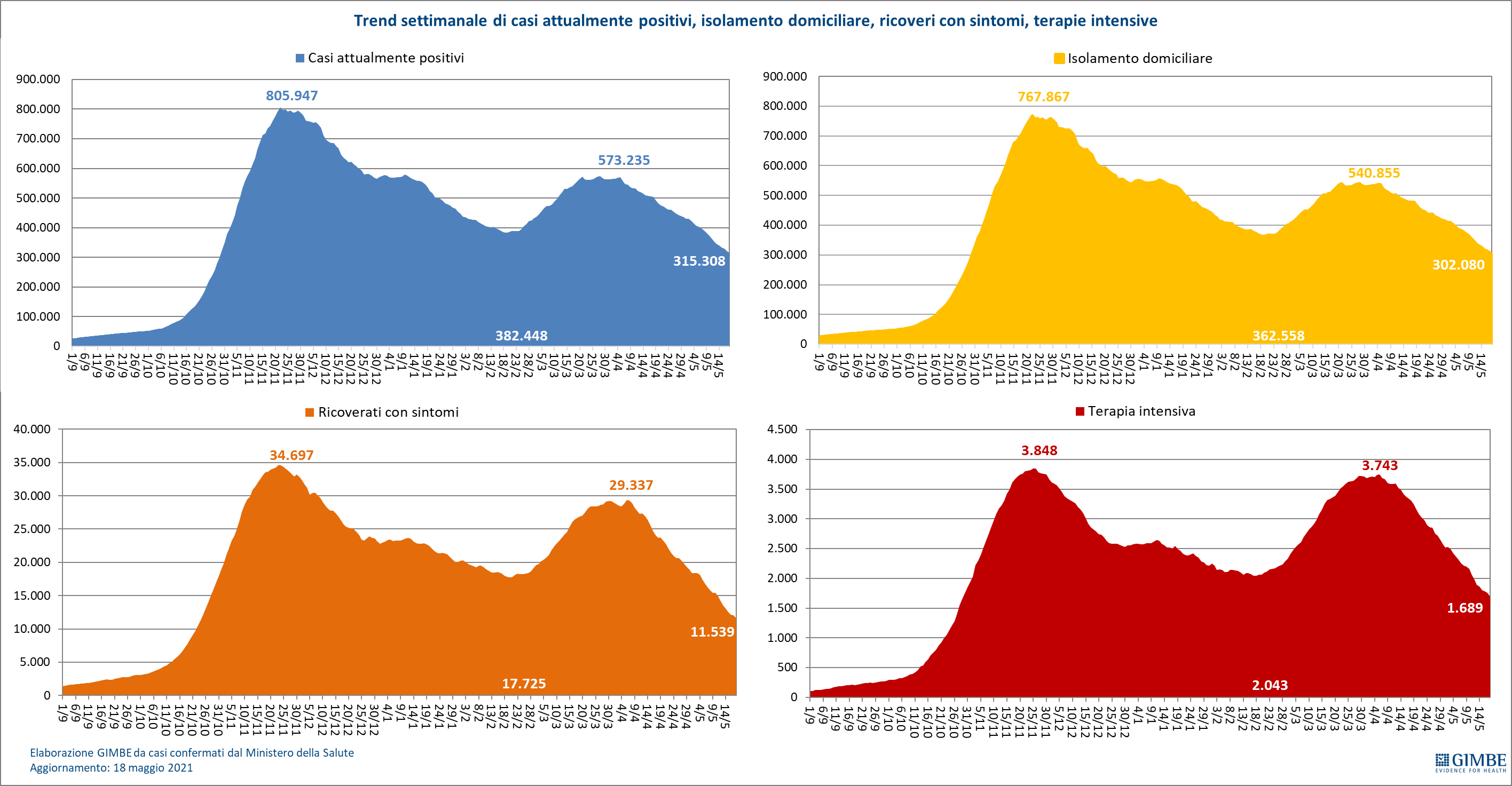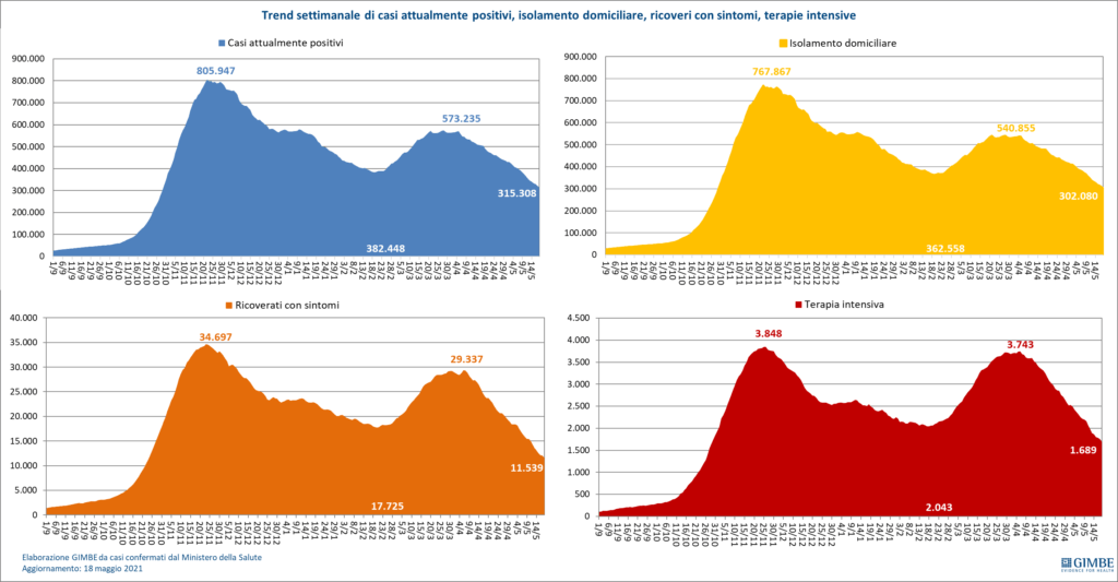 Guardando alla situazione epidemiologica nella settimana 12-18 maggio in confronto a quella precedente, Gimbe registra “una diminuzione di nuovi casi (43.795 contro 63.409) e decessi (1.215 contro 1.544). In calo anche i casi attualmente positivi (315.308 contro 363.859), le persone in isolamento domiciliare (302.080 contro 346.866), i ricoveri con sintomi (11.539 contro 14.937) e le terapie intensive (1.689 contro 2.056)”, evidenzia il report.