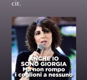 Giorgia non era riuscita a mordersi la lingua durante la campagna elettorale di Giorgia Meloni dell’estate 2022 in vista delle elezioni di settembre. In quell’occasione la cantante aveva postato una storia: «Anche io sono Giorgia, e non rompo i coglioni». Una frase che la futura premier ha preso male.