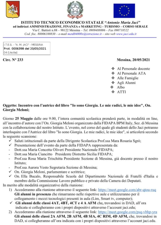 Al suo interno si chiede “all’intera comunità scolastica” di partecipare all’incontro con la leader di Fratelli d’Italia che si terrà in modalità online: chi non lo farà non avrà i crediti formativi previsti.