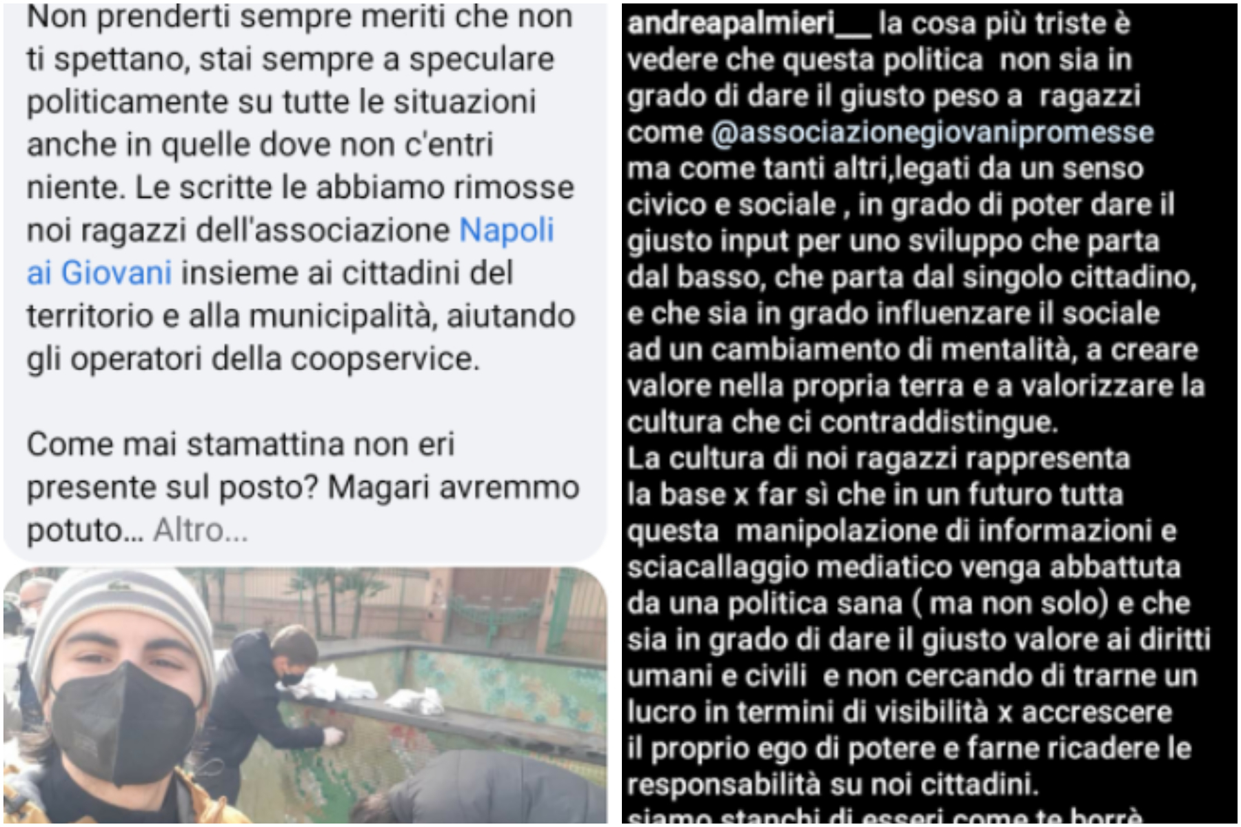 Questa la realtà dei fatti. Quella del mondo dei social vede invece Borrelli pubblicare le foto e intestarsi l’iniziativa cancellando e bloccando chi, sotto al post da lui pubblicato, ha provato a spiegare come sono andate le cose. Tutto inutile: o la pensi come lui o vieni censurato. Per Borrelli è tutto merito suo e del partito che rappresenta. La sua propaganda arriva a non riconoscere anche il contributo di Marcello Cadavero, assessore della II Muicipalità, colui che realmente si è attivato insieme all’associazione di giovani guidata da Paternoster, dal vicepresidente Andrea Capuozzo e dal segretario Raffaele Cosentino.