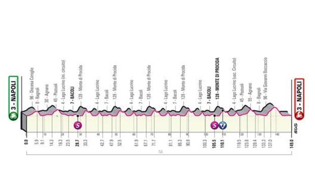 Si tratterà di un percorso insidioso. Si partirà da Napoli per raggiungere i Campi Flegrei attraverso discesa Coroglio, Bagnoli e Pozzuoli; i ciclisti percorreranno poi per 5 volte un circuito di circa 19 chilometri tra Bacoli e Monte di Procida; poi il ritorno sul lungomare partenopeo, in via Caracciolo, dove è previsto l’arrivo.