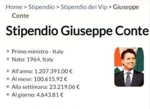 Il meme vede una foto del premier accompagnata dai dati anagrafici di Conte e quello che viene considerato il suo stipendio annuale (1.207.391 euro), anche diviso per mese (100.615,92 euro), settimana (23.219,06 euro) e giorno (4.643,81 euro).