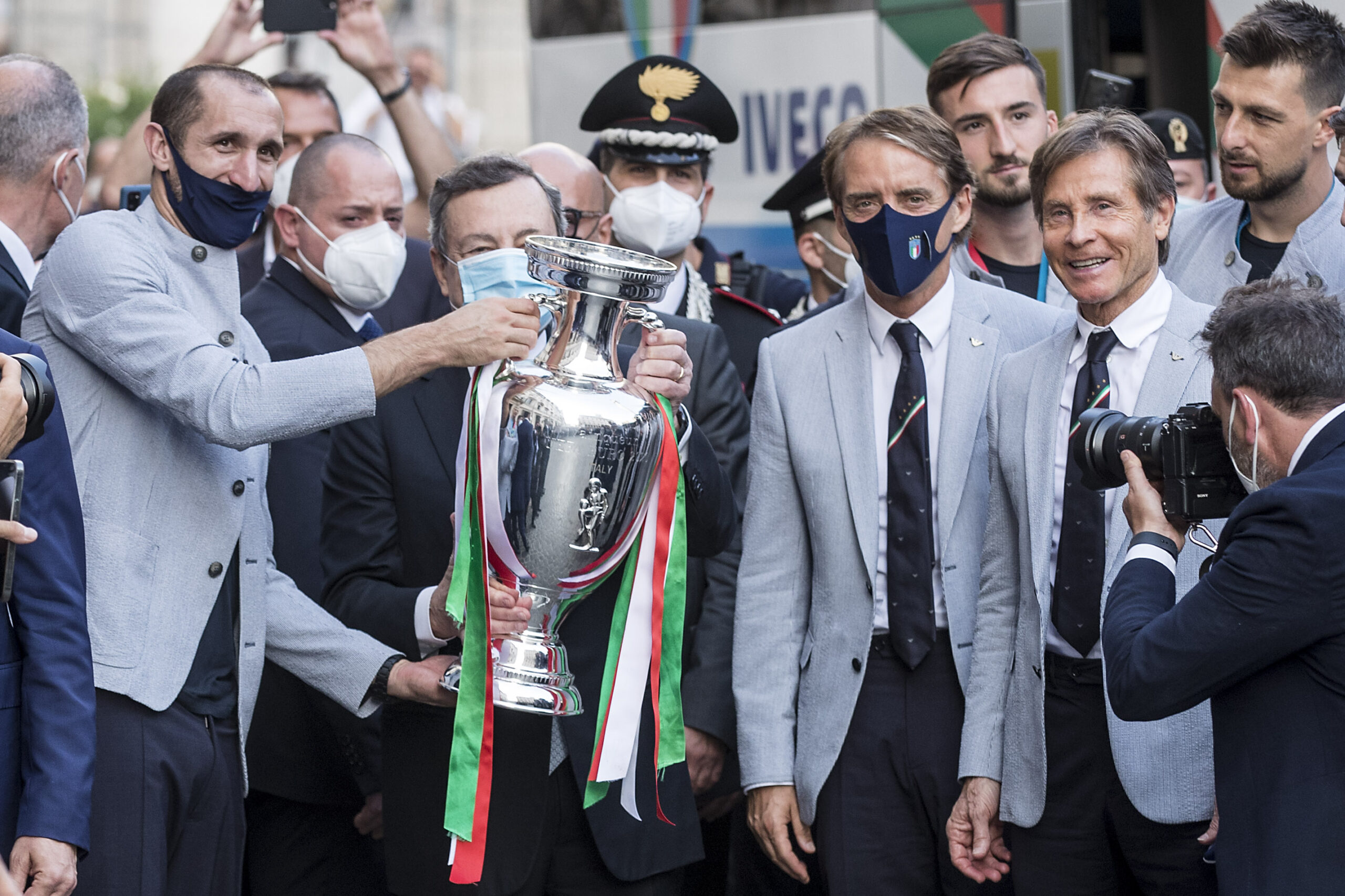 La cerimonia si è conclusa con la consegna delle targhe a tutti i giocatori della nazionale e poi la foto di rito. Ad attendere gli azzurri e il tennista Matteo Berrettini fuori da Palazzo Chigi un pullman scoperto per sfilare tra le strade del centro di Roma: sul bus campeggia la scritta “Campioni di Europa”.
