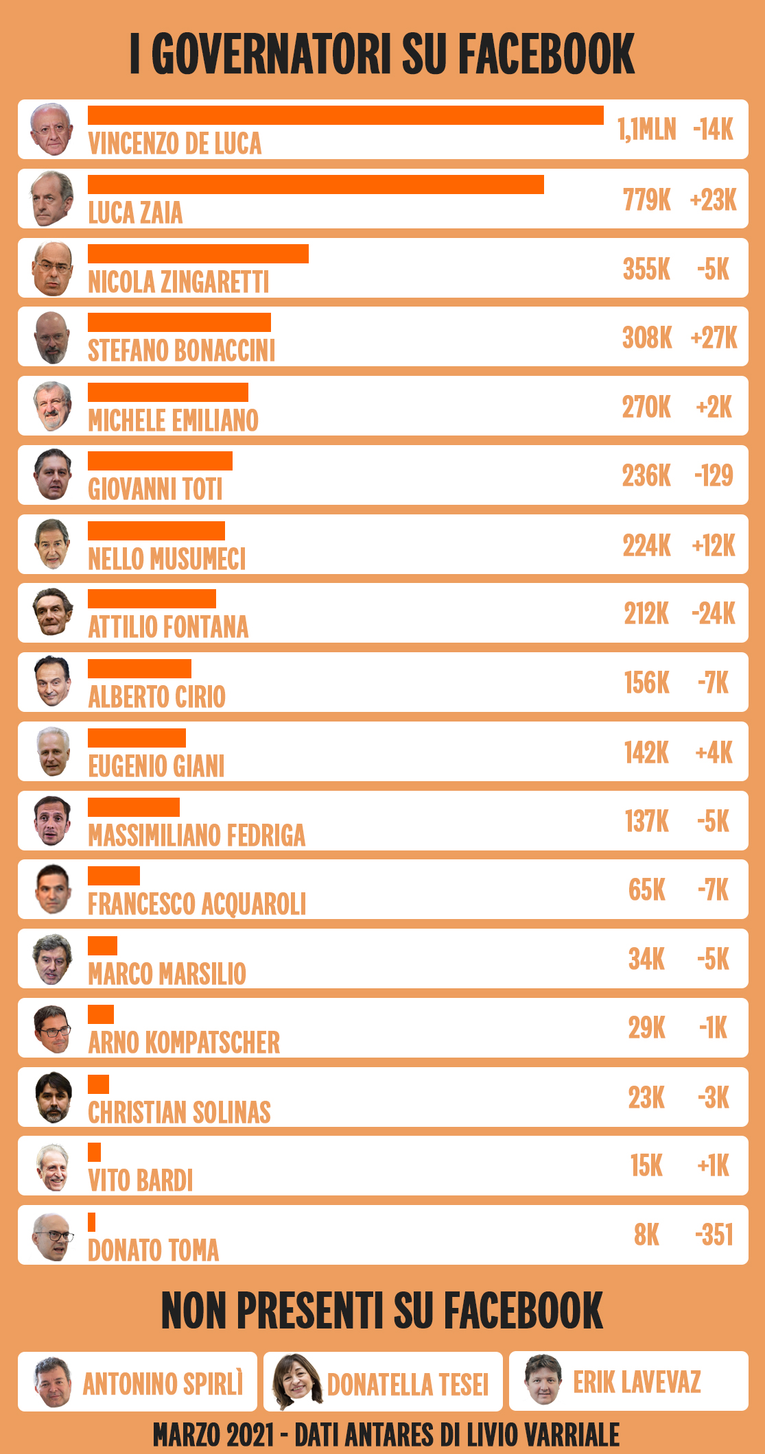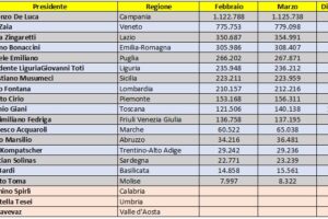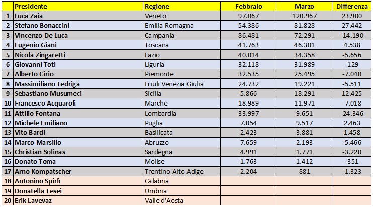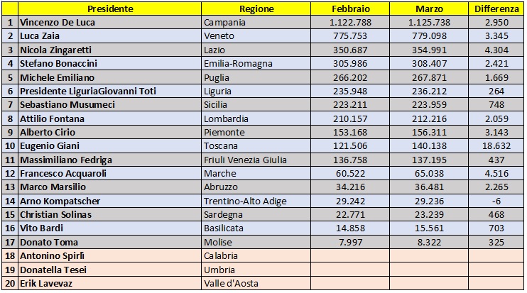 La classifica ci fornisce al primo posto il campano Vincenzo De Luca con 1.122.000 follower circa nel mese di febbraio, cresciuti di tremila unità nel mese di marzo. Al secondo posto della classifica c’è il Veneto Luca Zaia che da 775.000 followers è arrivato a 779.100 mentre al terzo posto c’è il dimissionario dalla segreteria del PD, Nicola Zingaretti, a quota 355.000.
