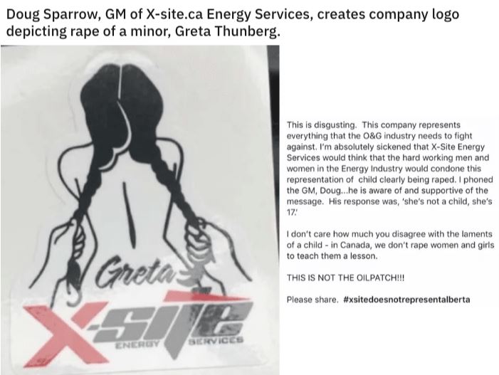 Una ragazzina con le treccine, il nome Greta disegnato sulle spalle e le mani di un uomo che la trattiene, pronto per violentarla. È la folle immagine utilizzata da un’azienda petrolifera canadese, che ha realizzato un adesivo contro la 17enne attivista svedese per il clima Greta Thunberg, già nominata persona dell’anno dal ‘Times’.