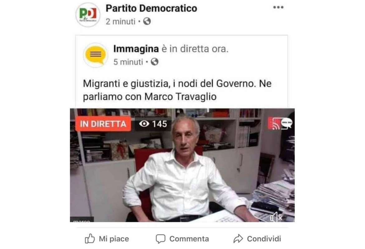 Eccola lì, spuntare all’improvviso, la diretta che non ti aspetti. In un giovedì sera di post lockdown, quando le offerte della movida serale sono portare giù l’umido o andare a trovare la zia Elvira, la sorella del nonno che hai visto una volta al battesimo di tuo cugino, ecco che il dopocena lo offre la pagina Facebook del Partito democratico: una diretta con Marco Travaglio per parlare di migranti e giustizia.