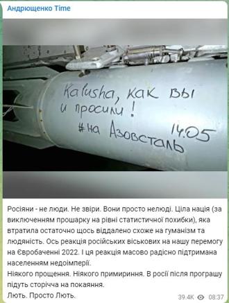 ORE 13:51 – MARIUPOL: RUSSI SCRIVONO FRASI BAND KALUSH SU BOMBE ACCIAIERIA – Gli ucraini accusano i russi di avere scritto su alcune bombe, presumibilmente destinate all’acciaieria Azovstal, le parole pronunciate dalla band ucraina Kalush dopo la vittoria all’Eurovision proprio per salvare l’acciaieria di Mariupol sotto l’assedio dei russi. La denuncia arriva dal consigliere del sindaco di Mariupol Petro Andriushenko che pubblica su Telegram alcune immagini, rilanciate dai media ucraini. “Questa è la reazione dell’esercito russo alla nostra vittoria all’Eurovision 2022”, scrive nel testo che accompagna le tre fotografie. Nelle foto, di cui è impossibile verificare l’autenticità né come sarebbero entrate in possesso degli ucraini, si vedono le bombe, non ancora sganciate, con delle scritte in inglese e in russo con un pennarello nero. “Aiutate Mariupol, aiutate l’Azovstal, ora“, è scritto in inglese su un ordigno, ovvero le parole pronunciate dal frontman dei Kalush, Oleh Psjuk, alla fine dell’esibizione. Su tutte le bombe è riportata la data di ieri, “14.05”. Su un’altra bomba, secondo quanto riporta Ukrinform, appare la scritta in russo “Kalush, come hai chiesto. Su Azovstal»