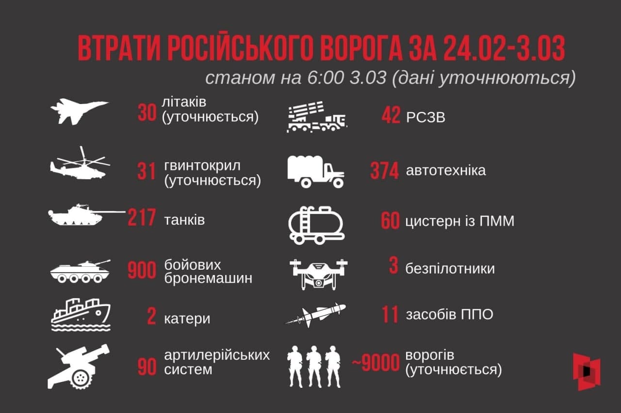 Informazioni operative dello Stato maggiore delle forze armate dell’Ucraina a partire dalle 06:00 del 3 marzo in merito all’invasione russa: