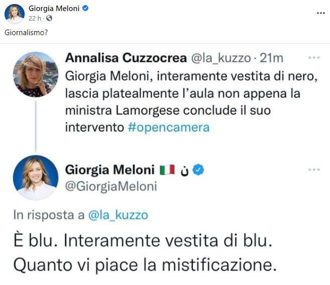 Un tweet ‘smentito’ da Meloni, che precisava infatti che il vestito era “blu, interamente blu”, accusando la cronista: “Quanto vi piace la mistificazione“. Alle accuse della leader di FdI la stessa Cuzzocrea aveva risposto evidenziano come non ci fossero intenti polemici o retropensieri: “Un bellissimo blu scuro allora. Oggi sono vestita di nero io. Nessuna mistificazione, solo la vista che peggiora“.