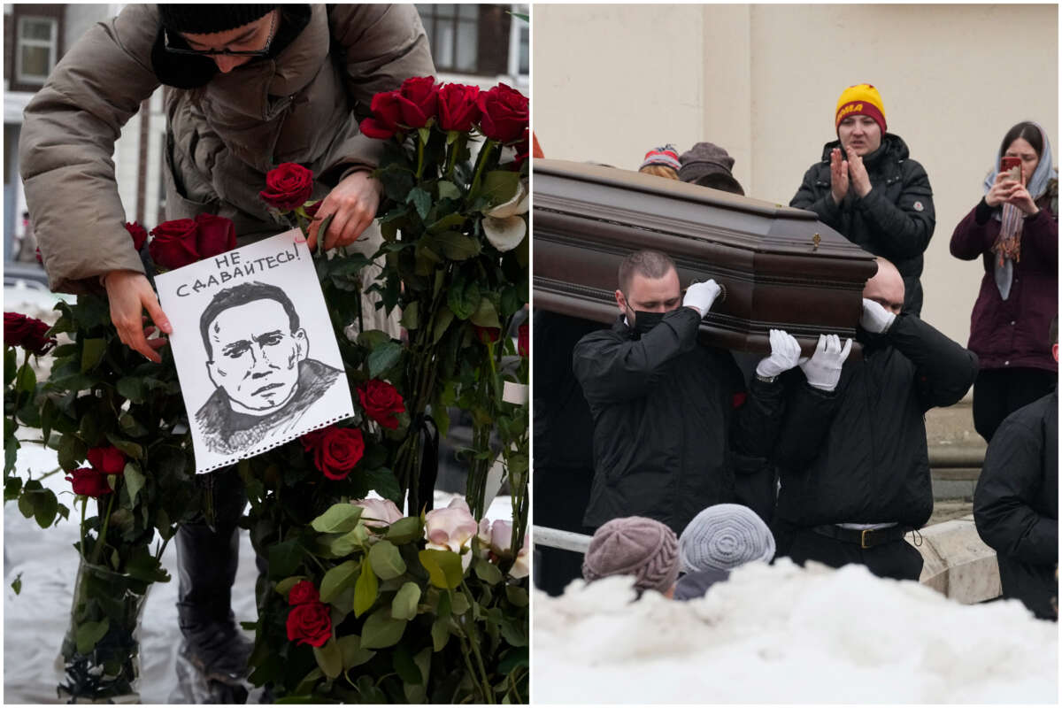 Le televisioni russe non hanno detto una parola o trasmesso una sola immagine dei funerali del capo dell’opposizione morto in circostanze mai chiarite. In compenso tutto ciò che accadeva veniva ripreso e ritrasmesso in streaming. Lyudmila, madre di Alexei, era circondata da persone che le si affollavano intorno e spiccava un cartello su cui era scritto “Grazie per tuo figlio” e “Perdonaci”.