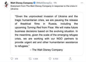 Disney ha fatto sapere, tramite un comunicato, di bloccare l’uscita in Russia del film d’animazione targato Pixar Turning Red, che in Italia arriverà l’11 marzo direttamente sulla piattaforma Disney+.