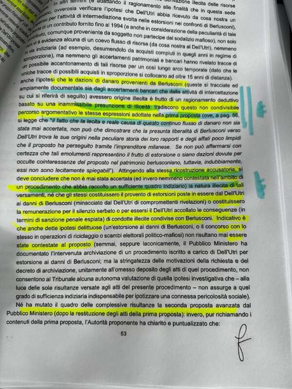E così si presume, si deduce e si ipotizza anche in merito all’estorsione che Dell’Utri avrebbe esercitato sul suo benefattore: dammi i soldi, sennò spiffero tutto. Ipotesi rispetto alla quale il tribunale, oltre alla noiosissima considerazione secondo cui l’ipotesi è del tutto sfornita di qualsiasi riscontro probatorio, oppone il grammo di buon senso per cui apparirebbe un po’ strano, poco verosimile, se non addirittura incredibile, che Berlusconi eseguisse quei pagamenti, frutto dell’estorsione, squadernandoli in faccia a un esercito di avvocati, consulenti, commercialisti, esponenti di partito, funzionari d’azienda, segretarie: tutta gente che, si è appreso, sapeva perfettamente di quelle regalìe e che chiunque, prudentemente, terrebbe all’oscuro di operazioni tanto losche e così facilmente denunciabili.