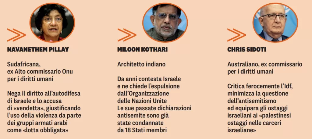 Da anni contesta Israele e ne chiede l’espulsione dall’Onu; le sue passate dichiarazioni antisemite erano già state condannate da 18 Stati membri. Infine c’è Chris Sidoti, australiano: ha definito quello di Israele “uno degli eserciti più criminali al mondo”, ha più volte minimizzato la questione dell’antisemitismo, arrivando a dichiarare al Consiglio per i diritti umani nel 2023 che “le accuse di antisemitismo vengono lanciate come il riso ai matrimoni”, e nel 2025 ha equiparato gli ostaggi israeliani ai “palestinesi ostaggi nelle carceri israeliane”, mettendo sullo stesso piano vittime civili innocenti e terroristi assassini condannati.