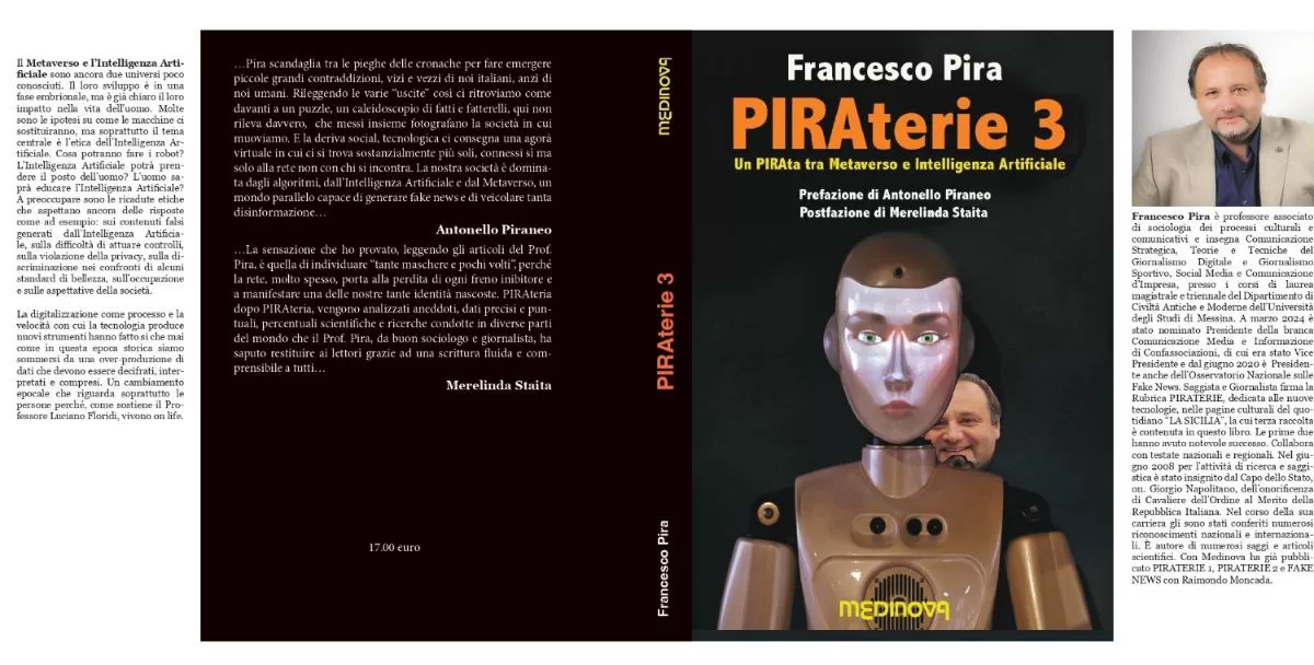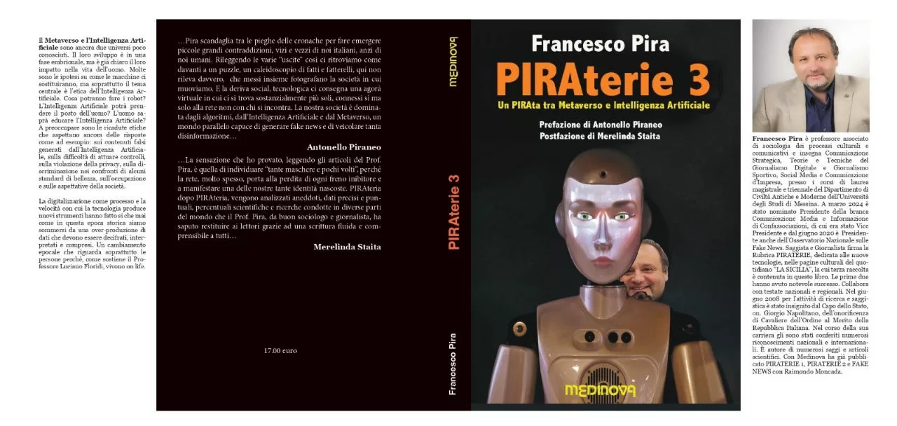 Metaverso e Intelligenza Artificiale. Se ne parla tanto, al punto che per molti siamo già da tempo a un punto saturazione comunicativa. All’interno di “PIRAterie 3” (Edizioni Medinova), se ne parla in maniera differente. Si tratta di un saggio in cui l’autore, Francesco Pira, parte da fatti di cronaca e accadimenti in rete per elaborare micro-analisi sociologiche. “Proviamo a raccontare col sorriso la nostra società, il nostro modo di vivere e di rapportarci con le nuove tecnologie. Le temiamo ma sappiamo che ci sono diventate indispensabili”. Si tratta di un vero e proprio viaggio che l’autore, con la complicità dell’editore indipendente, Antonio Liotta, e la prefazione del direttore del quotidiano La Sicilia, Antonello Piraneo, fa compiere al proprio PIRAta all’interno di questi due mondi inesplorati.