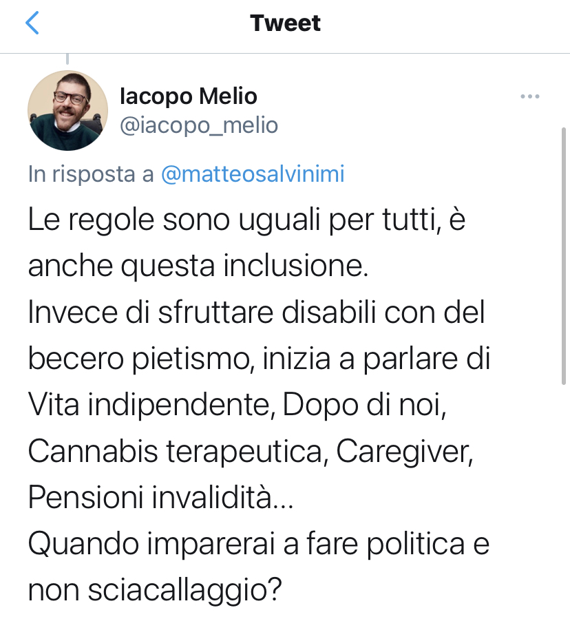 Iacopo Melio non le manda a dire a Matteo Salvini. Glielo scrive chiaro e tondo su Twitter: basta strumentalizzare e sfruttare le battaglie dei disabili. Così il consigliere regionale fiorentino del Partito Democratico zittisce il segretario della Lega sui social, senza tanti giri di parole. Melio è giornalista, scrittore e attivista per le battaglie sui diritti umani e civili, con particolare attenzione al tema della disabilità. E’ stato eletto come consigliere regionale in Toscana, con 11.233 voti a Firenze, campione di preferenze. Ha fondato la onlus Vorrei prendere il treno ed è stato insignito della medaglia di Cavaliere al Merito della Repubblica.