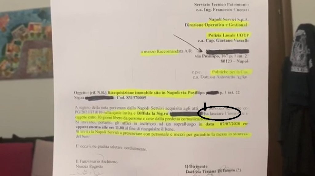 Una storia raccapricciante che lo stesso legale della famiglia Resicato ha provato a far rientrare, inviando una pec alla Napoli Servizi lo scorso 10 giugno con oggetto “Riscontro e contestazione vs. diffida del 26 maggio per rilascio abitazione” e, non ricevendo alcuna risposta, contattando telefonicamente l’assessore alle Politiche per la Casa Monica Buonanno senza, tuttavia, far rientrare la “riacquisizione del sito” (tra l’altro in una delle diffide inviate dalla Napoli Servizi alla 78enne è presente anche un grave errore di grammatica).