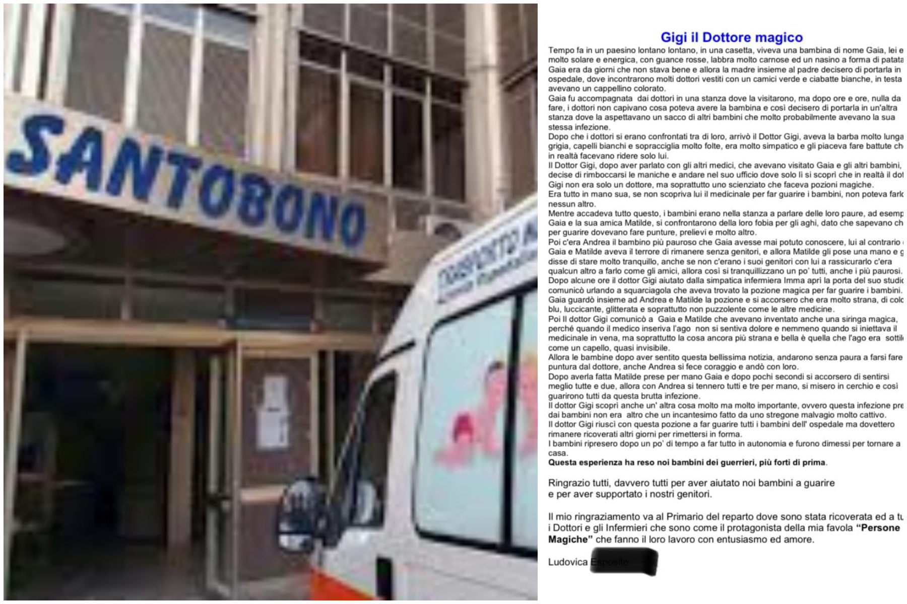 Ha ripercorso in un tema l’esperienza vissuta durante il periodo natalizio all’ospedale pediatrico Santobono di Napoli, ringraziando il personale sanitario e soprattutto “Gigi, il dottore magico” che ha ha guarito tutti i bambini con una “pozione magica, blu, luccicante e soprattutto non puzzolente come le altre medici”. Protagonista la piccola Ludovica, una bambina che vive nel nord-est Italia e che lo scorso dicembre, durante le vacanze di Natale, era a Napoli con i genitori (di origine campana).