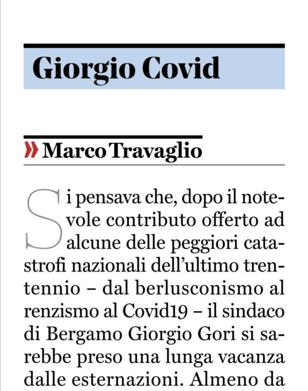 Il sindaco di Bergamo Giorgio Gori? Nell’editoriale in prima pagina di Marco Travaglio diventa ‘Giorgio Covid’, con una ‘battuta’ tetra in bella mostra nell’editoriale del direttore del Fatto Quotidiano che ha scatenato un vespaio di polemiche.