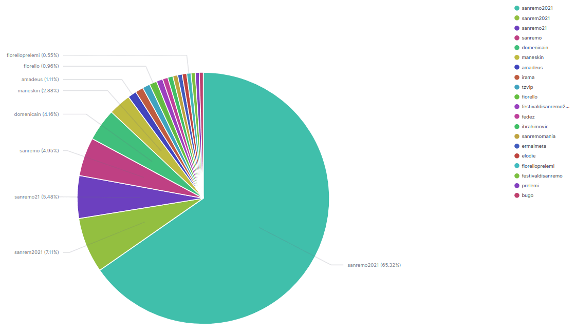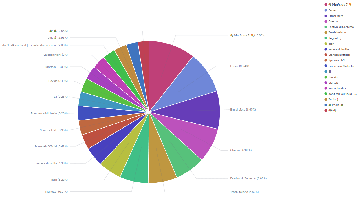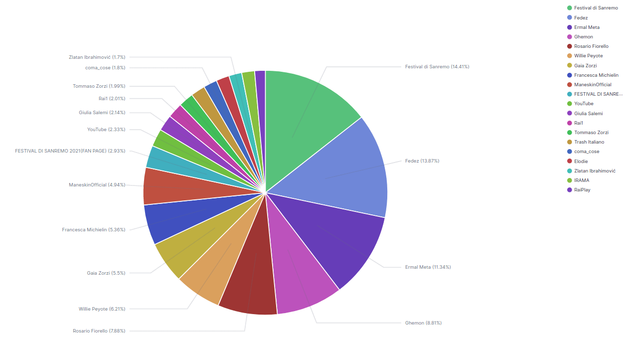Quali sono stati i profili maggiormente tirati in ballo dagli utenti? Oltre al festival ed ai suoi tre artisti più social, gli utenti hanno coinvolto più volte Fiorello. Willie Peyote e Maneskin ancora in mezzo alla classifica battuti dalla Michiein che ringrazia Fedez per la popolarità social. A testimonianza dell’inquinamento del Festival da fattori esterni, non è un caso che tre del mondo dei reality, i fratelli Zorzi e Giulia Salemi, si siano ritagliati una fetta di notorietà sul festival, distraendo il dibattito dal contest musicale. “Ed è qui forse che c’è da domandarsi se il Festival di Sanremo sia una manifestazione canora oppure l’occasione commerciale perfetta per stilisti, pubblicitari e agenti di spettacolo forti dei like di un pubblico disinteressato a quella componente che un tempo ha fatto la storia della musica mondiale: la canzone italiana”.